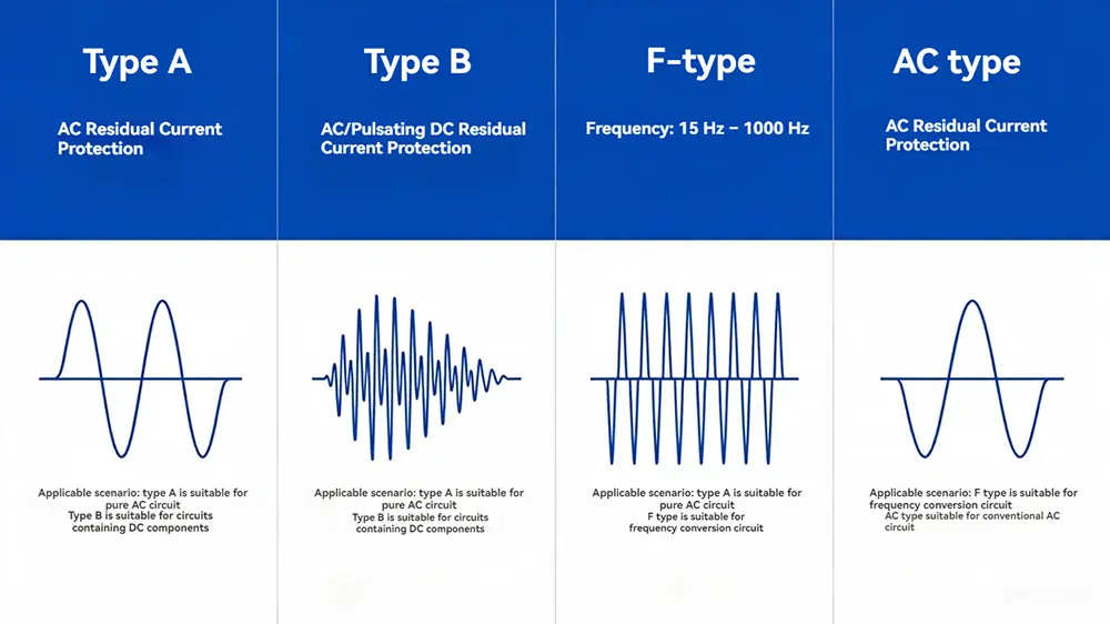 | अवशिष्ट वर्तमान प्रकार | एसी प्रकार | साइनसॉइडल एसी अवशिष्ट प्रवाह; सामान्य प्रकाश, सॉकेट्स आणि प्रतिरोधक भारांसाठी. |